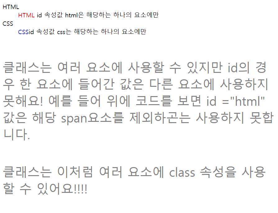 <div class ="multi">클래스는 여러 요소에 사용할 수 있지만 id의 경우 한 요소에 들어간 값은 다른 요소에 사용하지 못해요! 예를 들어 위에 코드를 보면 id ="html" 값은 해당 span요소를 제외하곤는 사용하지 못합니다.</div>