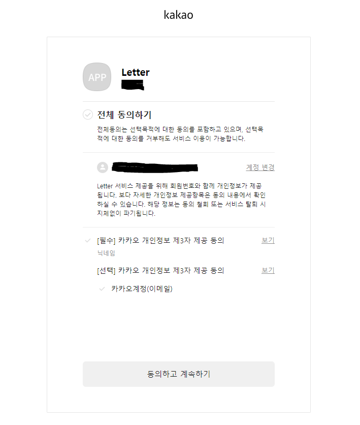 저의 경우에는 "닉네임" 과 "카카오계정(이메일)" 정도만 동의 항목으로 체크해주었습니다. 😀