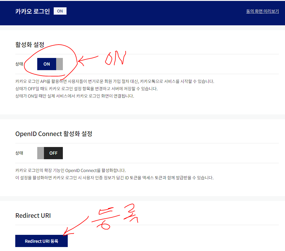 활성화 설정에서 상태를 ON 으로 바꿔주시면 아래 Redirect URI 구역이 나오게 됩니다. Redirect URI 등록을 눌러주시면