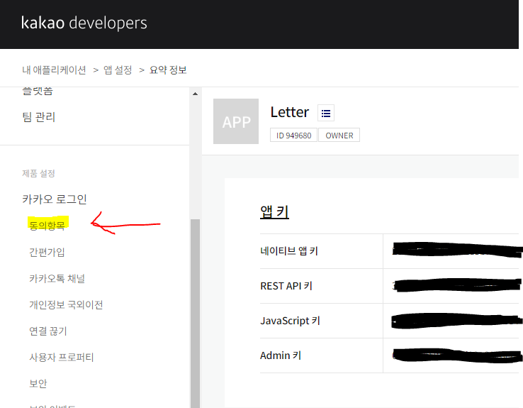 저는 REST API KEY를 사용할 것 입니다. KEY가 준비되었으면 다음으로는 동의항목으로 가보시죠