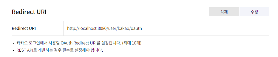 위와 같은 창이 뜨는데 원하시는 인가코드를 받을 uri를 등록해주시면 됩니다.