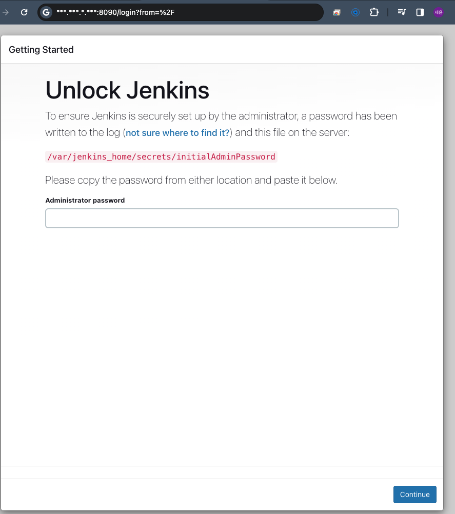 이제 젠킨스로 접속해보시죠. 사용한 EC2의 public Ip : 8090으로 접속해주면됩니다.