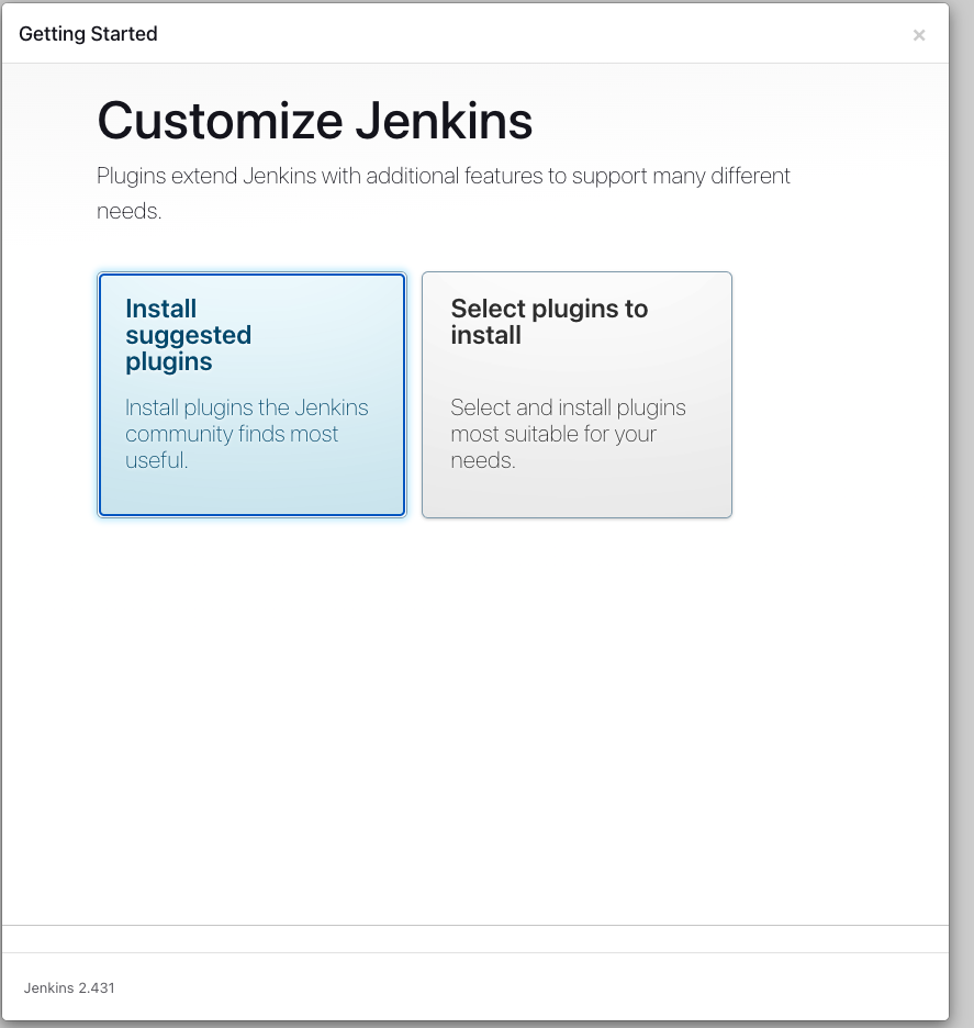 확인한 비밀번호를 입력하고 Continue를 누르면 다음과 같은 화면이 나온다. 해당 화면은 플러그인을 설치할 때, jenkins쪽에서 제안한 플러그인을 설치할건지, 사용자가 직접 골라서 설치할건지 고르는 것이다. 저는 제안해주는 플러그인을 설치하겠습니다.
