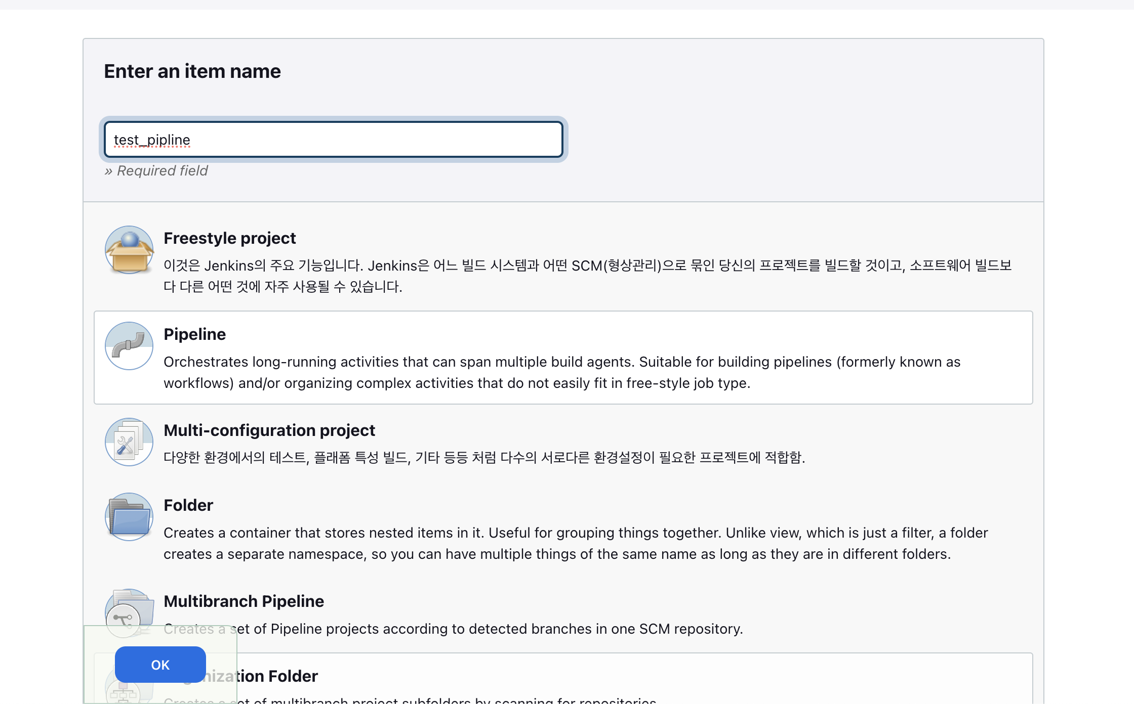 들어가셔서 item의 이름을 입력하시고, Pipline을 클릭해주신 다음 OK 버튼을 누르시면 됩니다.