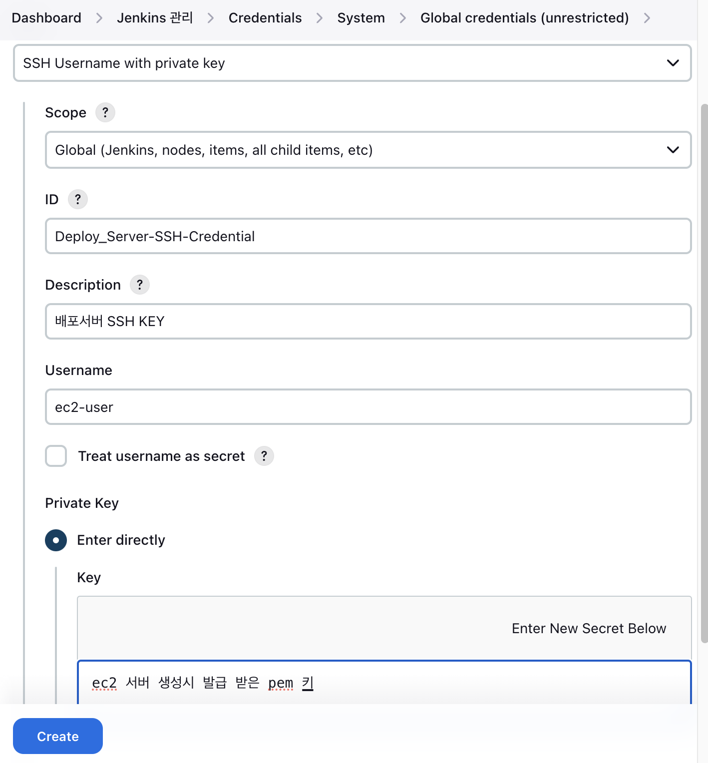 - ID : 추후 Pipeline Script 작성 시 credentialsId로 사용됨