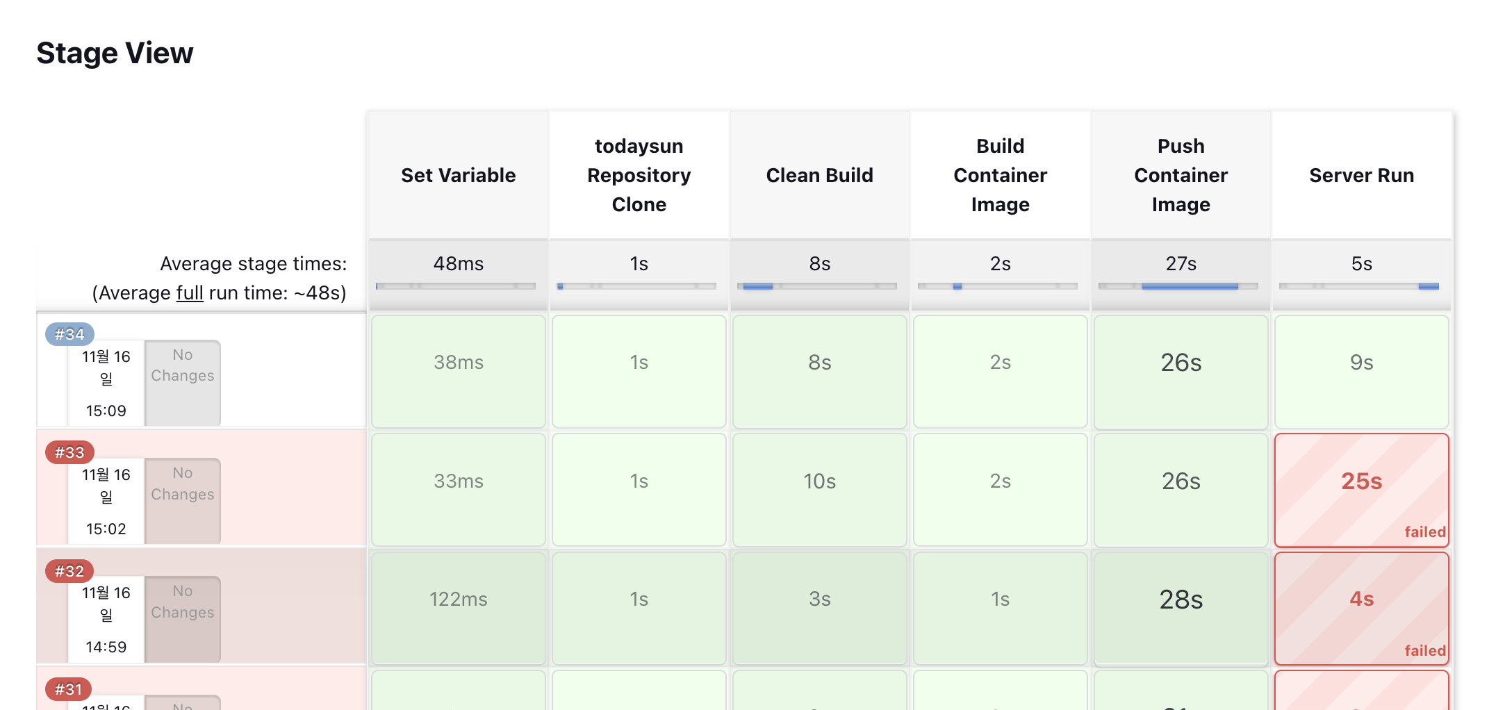 저같은 경우는 JenkinsFile에 오류가 있어서 잡으면서 진행했기 때문에, 시도횟수와 실패 흔적들이 있습니다. ㅠㅠ